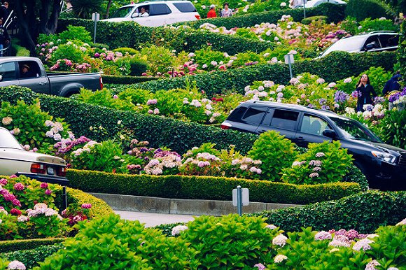 Lombard Street 美国旧金山 旧金山九曲花街是世界上最弯曲的街道。当初在19世纪20年代的时候,是为了使繁忙的交通有所喘息而设计建造的,如今却成为旧金山最吸引人的一条街。这里的八个急转弯加上40度的斜坡,且弯曲像“Z”字形,所以车子只能往下单行。街道上遍植花木,春天的繍球,夏天的玫瑰和秋天的菊花,把它点缀的花团锦簇。还可远眺海湾大桥和科伊特塔,如不开车,可顺着花街两旁人行步道观景。
