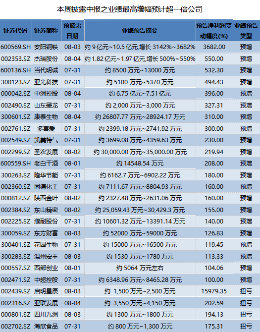 剔除扭亏,业绩预增最高翻倍的公司有21家,安阳钢铁(600569.SH)、杰瑞股份(002353.SZ)、当代明诚(600136.SH)、亚光科技(300123.SZ)、中洲控股(000042.SZ)、山东墨龙(002490.SZ)、康泰生物(300601.SZ)、多喜爱(002761.SZ)等8家公司业绩最高预增幅超过3倍。