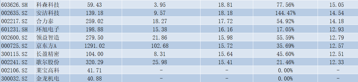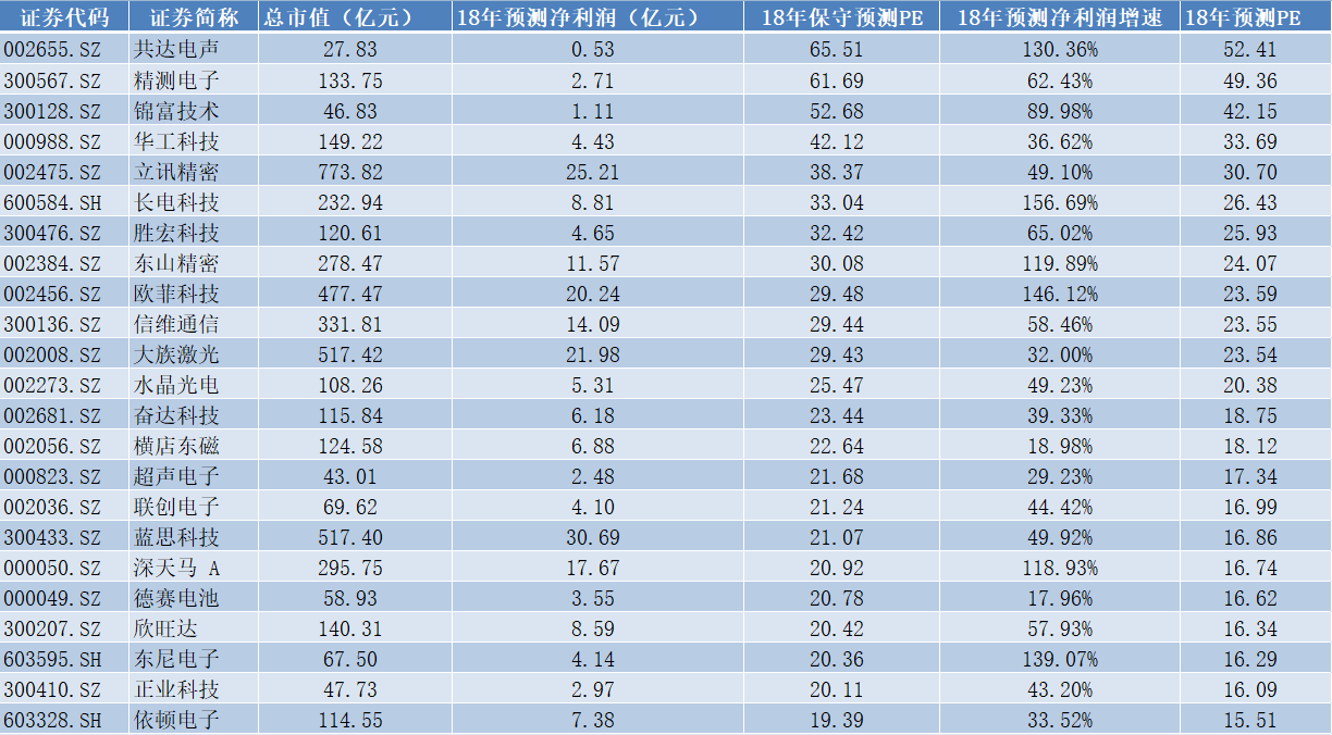目前,通过券商一致性预测计算出的整个手机产业链18年市盈率中位数为16.99倍,不过结合今年上半年行业的净利润增速情况以及今年手机小年的现状,上述中位数情况过于乐观,采用保守预测出的21.24倍更为合理。
