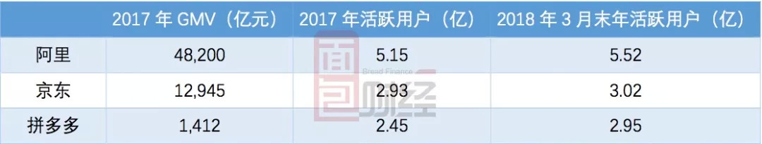 截至2018年3月末,阿里年活跃用户为5.52亿,京东为3.02亿,拼多多的用户数与京东已经十分接近。而在2018年一季度新增活跃用户数上,拼多多为5000万,阿里为3700万,京东为900万。