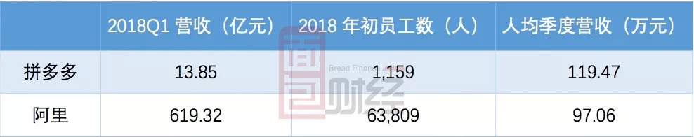 2018年一季度,拼多多人均营收为119.47万元,同期阿里为97.06万元。