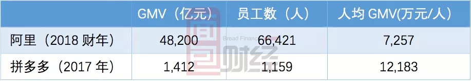阿里2018财年(即2017年4月1日至2018年3月31日)人均GMV为7257万元,而拼多多在2017年人均GMV高达12183万元,是阿里的1.68倍。