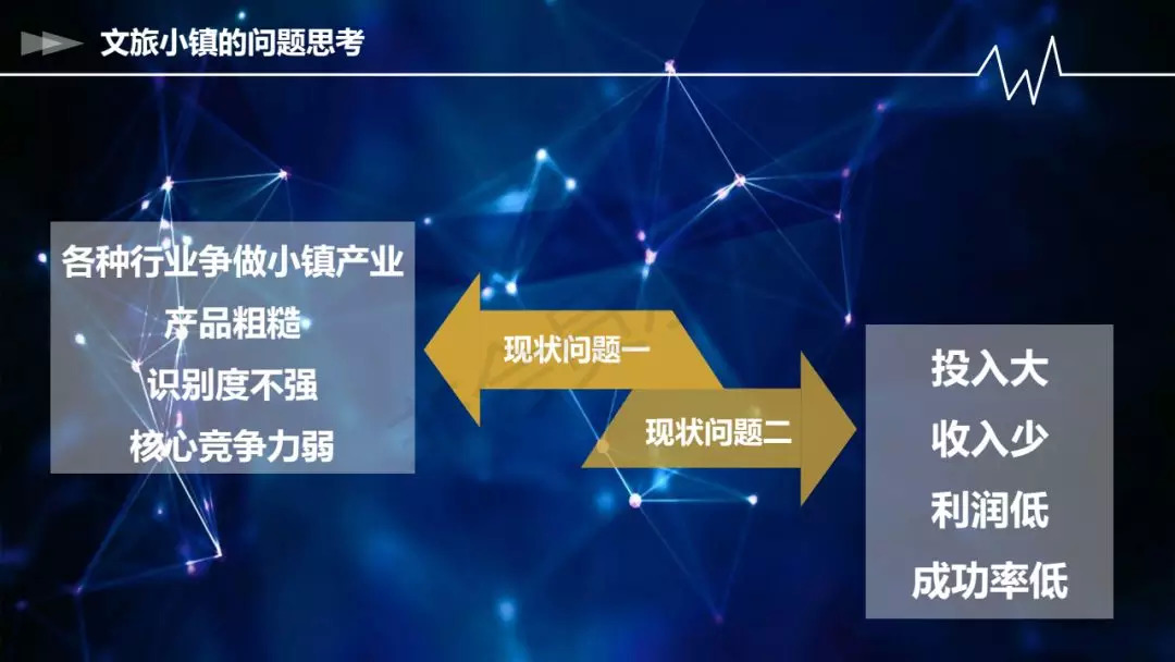 第一,千镇一面。只要一个小镇成功了,所有的小镇全照着做,那么就导致产品识别度不强、核心竞争力弱,这个是现况问题。