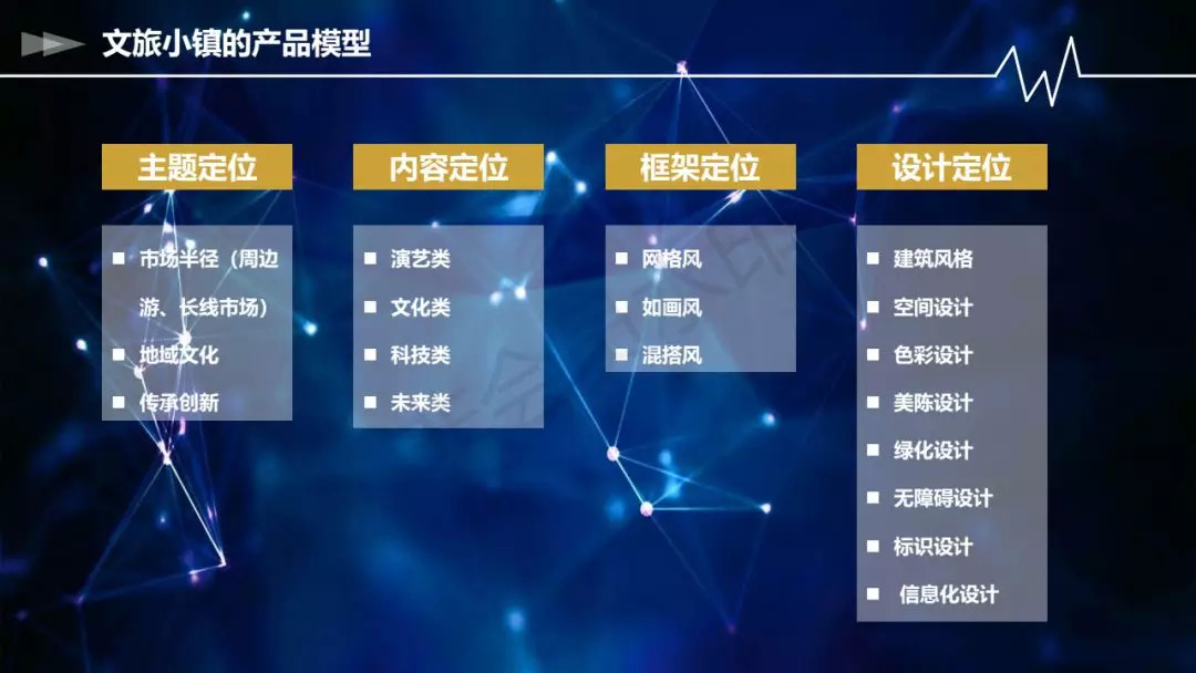 从以上主题定位、内容定位、框架定位和设计定位,就已经决定了整个文旅小镇的产品模型。简单讲,就是有主题、有内容、有调性、有细节,组成了整个的产品模型。