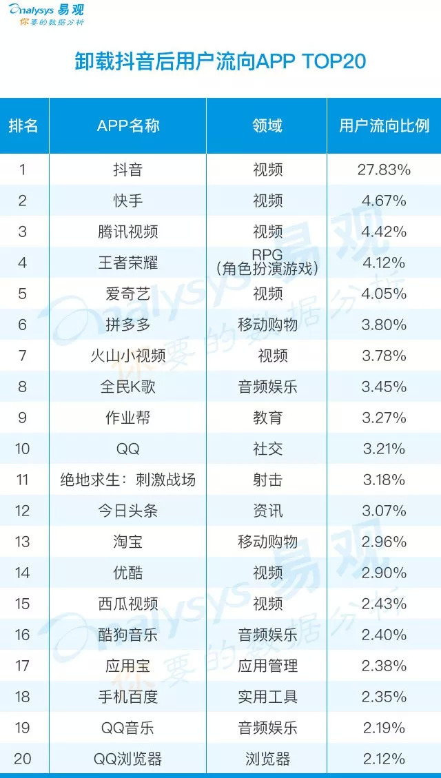 易观联合数据合作伙伴,通过用户安装列表对比差异,推算卸载抖音的用户重新安装了哪些APP,并将估算出新下载量占比前20的APP列入“卸载抖音的用户流向APP”榜。结果显示,有27.83%的人重新下载了抖音。也就是说,这些人刚跟抖音说了再见,立马又把它找了回来,并且又将抖音送到了榜首的位置。