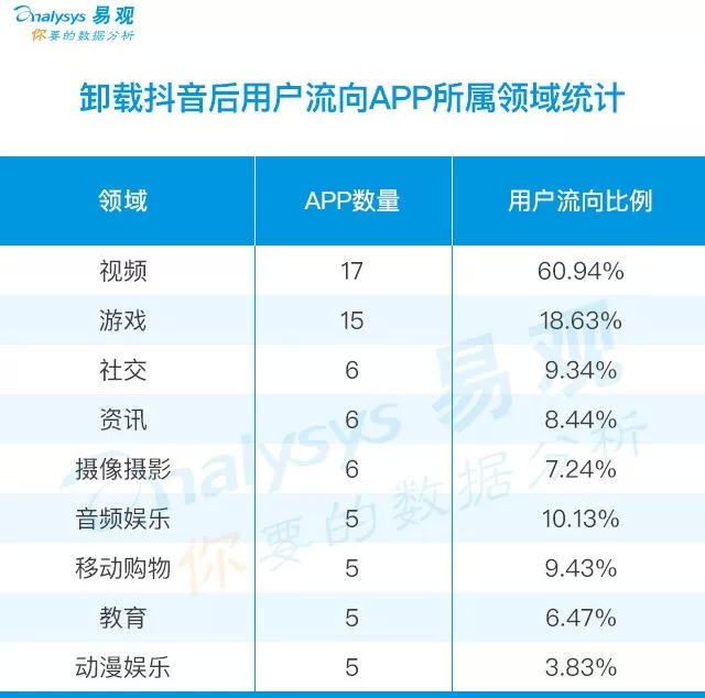 卸载抖音的用户流向APP所属领域统计