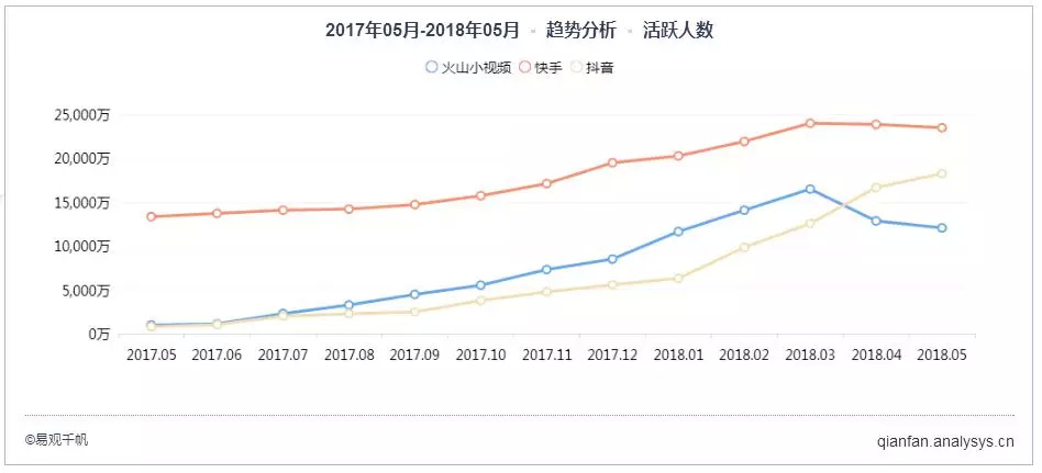 易观千帆数据显示,在近一年的时间里,抖音的活跃用户规模一路高歌猛涨,截至今年5月已达18214.81万人。从2017年9月跻身短视频综合平台TOP3开始,抖音加速前进,用半年时间超过本是头条系同根生的火山小视频,在春光明媚的四月天荣登行业第二的宝座。