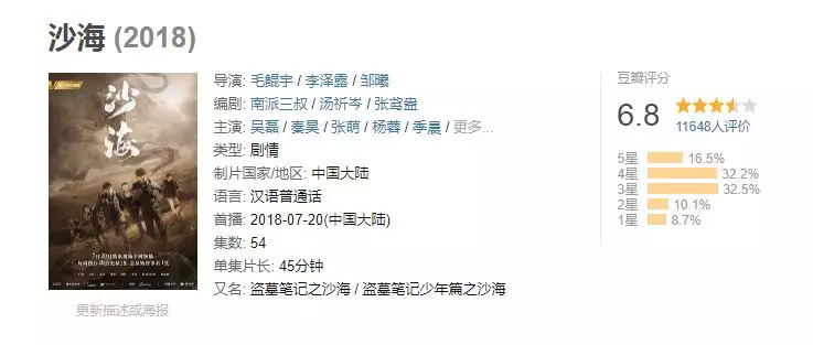 屈指算来,这已经是《盗墓笔记》系列在影视化尝试中的第四次出击,此前《盗墓笔记》同名网剧与电影,《老九门》网剧虽然热度非凡,但都遭遇了口碑滑铁卢,最终被观众所遗弃。在豆瓣上拿到6.8评分的《沙海》,已然是《盗墓笔记》系列的最佳表现,翻拍之作的声名不胫而走。
