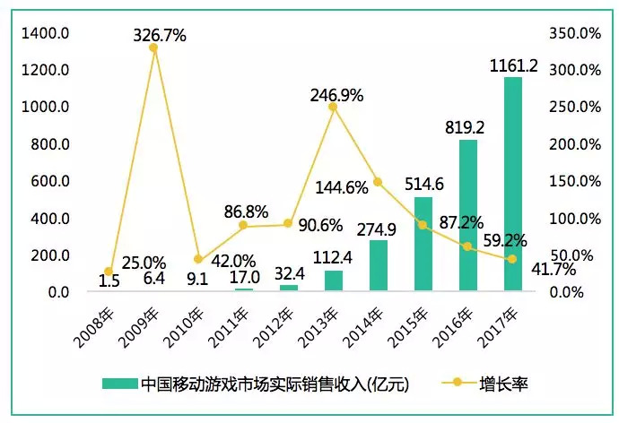 根据中国音数协游戏工委(GPC)发布的《2017中国游戏产业报告》,2017年中国游戏市场实际销售收入为2036.1亿元,其中移动游戏占57%,为1161.2亿元。