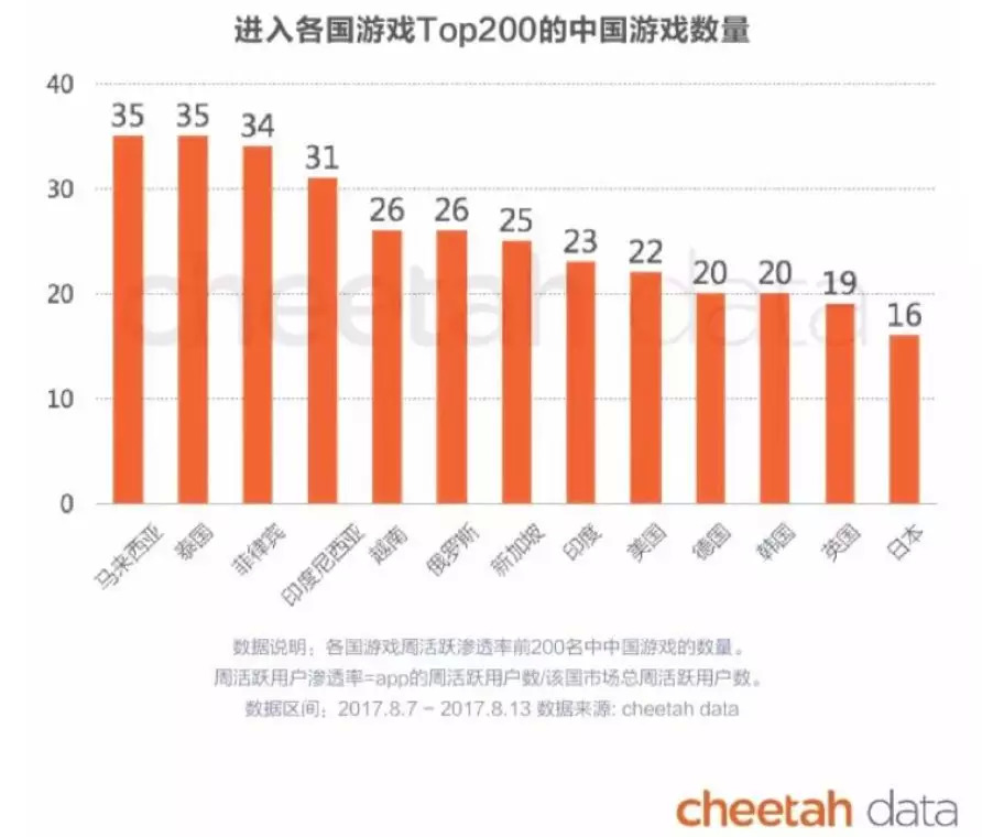 根据猎豹全球智库《2017中国游戏出海年度报告》中国游戏进入各国游戏榜单前200名的数据,排名前五的全是东南亚国家。考虑到东南亚及日韩两国的游戏用户体量有限,该地区恐怕很难一直支持中国手游的向外扩张需求。而如何攻入游戏市场更成熟,竞争更激烈,文化差异更大的欧美诸国,恐怕是国内厂商们未来亟待解决的问题。