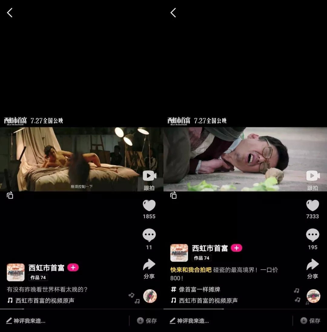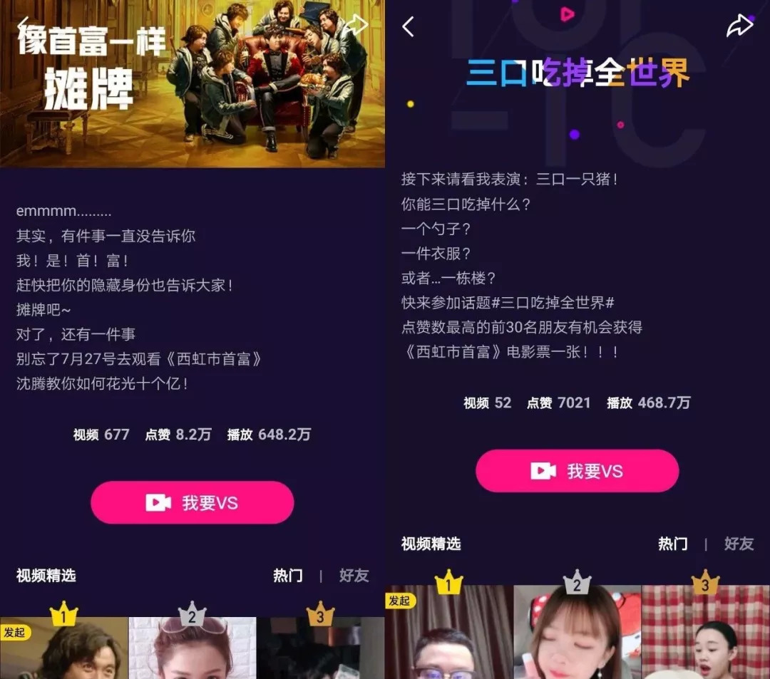 另外,微视还发起了多个电影相关话题挑战,其中“像首富一样摊牌”的视频累计播放量已经达到648万次,“三口吃掉全世界”的视频累计播放量也在468万次以上。