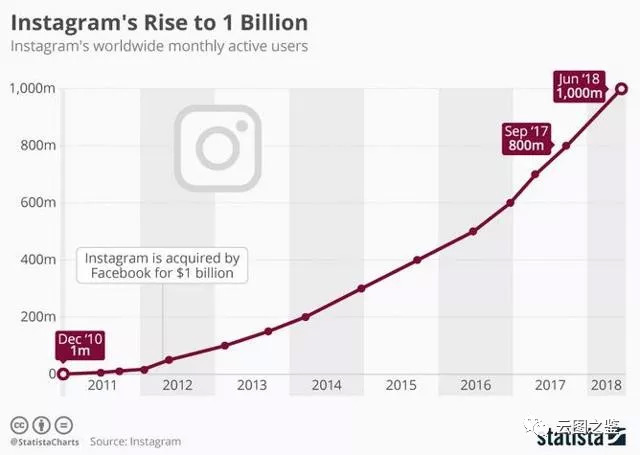企业是时代的产物。在移动时代来临时Facebook和腾讯都及时换上了新引擎,为自己续上了数亿秒。但相较于腾讯的略显窘迫,Facebook显得更加从容,其移动端转型最早可以追溯到2008年7月推出iPhone版Facebook;而收购Instagram更是早早地为自己备好了压制Snapchat的利器,时至今日Instagram MAU已突破10亿(如下图),而Snap近来用户增长遇到瓶颈;2014年Facebook大手笔190亿美元收购WhatsApp,更让我们看到了扎克伯格消灭潜在对手、获取差异化用户的决断力。