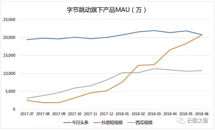 时间再拨到一年后,字节跳动旗下产品在一年内跑出了如上曲线,Feed类产品分别到达了自身瓶颈,成为重要的变现支撑;而UGC短视频产品抖音不仅超越了头条主应用,更是延续着可怕的生长力,令社交帝国腾讯走下王座、推开快手,亲自下场封杀和跟随。