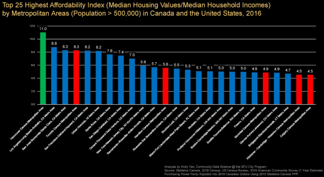 根据温哥华西蒙菲莎大学(Simon Fraser University)最新研究,在全北美买不起的地产排名中,温哥华超越洛杉矶,纽约和旧金山等美国大城市,拿下榜单第一名。而加拿大另一大都市多伦多,则名列第四。和多伦多同处安大略省的汉密尔顿排列第12位。在温哥华买一个普通公寓的平均价位已经达到$692,452加币,而在多伦多,普通公寓的均价也达到$561,079加币。