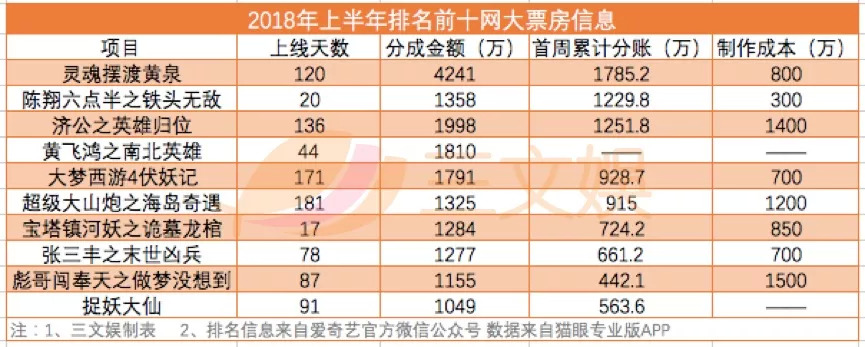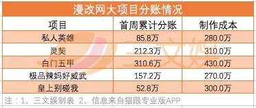 2018 年, 5 部在爱奇艺独家上线的网大作品中(只有爱奇艺接入了猫眼平台,提供了具体的票房数据),制作成本最低的是由现代少女恋爱向漫画改编的网大作品《极品辣妈好威武》,约为270 万元,最高的是玄幻武侠类漫画改编的《白门五甲》,制作成本为 430 万。