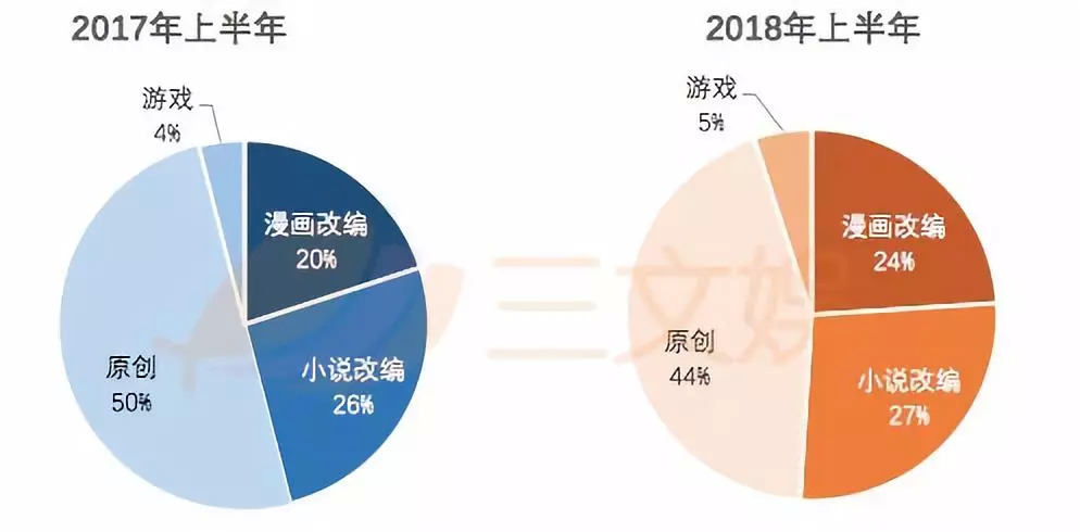 据三文娱不完全统计,2018 年上半年共有 41 部国产动画番剧上线,比 2017 年同期多出 11 部。其中,漫画和小说的动画化在其中的占比, 从2017年上半年的46%增加至2018年上半年的51%。