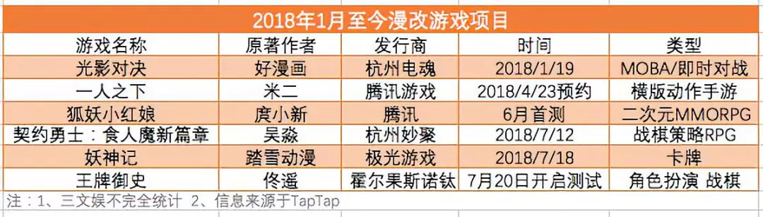 对比漫改网大和漫改番剧,漫改游戏数量少。三文娱在查询了 TapTap 排行榜中 Android 游戏榜、iOS 游戏榜中产品的信息后发现,2018年上半年,已知的漫画改游戏产品不多——有3 款。其中的部分原因,或与版号、改编难度等有关。