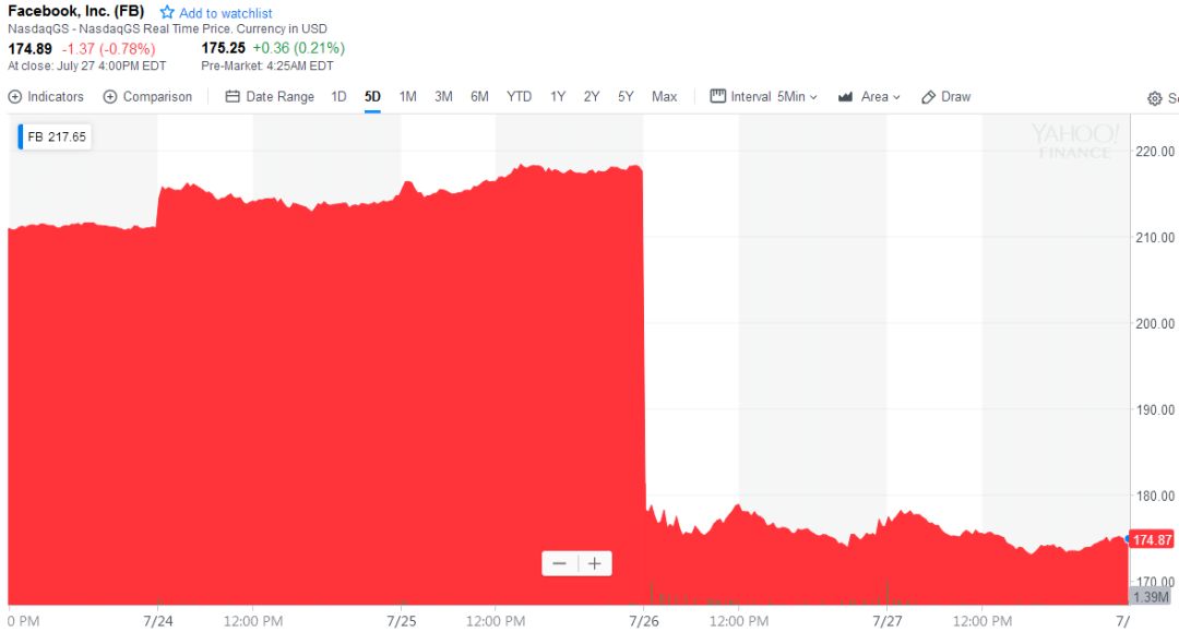 时隔一周,同样因用户增长放缓,脸书沦陷。7月26日,脸书股价暴跌18.96%,市值蒸发近1200亿美元,成为美国上市公司有史以来一天内市值损失之最。