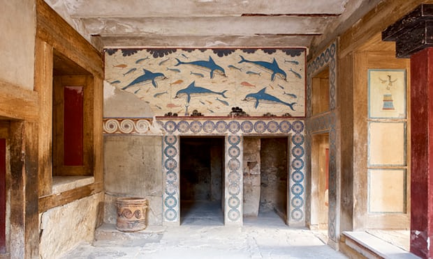 这次旅行的点滴瞬间我都历历在目。看到克诺索斯宫殿明显的修复痕迹时,爸爸这时候说,我们的体验有点掺水了,没有那么真实了。我记得当时那里有一堆用来储存水或粮油的大口赤土陶瓷坛,它们一个个都超级高,赫然耸立,像是压在我的头顶。我还记得我们走下楼梯,来到宫殿的中心,眼前是一个装满纯水的浴池,据说是古代皇后洗澡的地方,至少导游是这么给我们介绍的。宫殿里还有一个石头雕刻的宝座,窄窄的靠背雕刻出波纹的曲线,就像《纳尼亚传奇》里的王座一样,墙上画着神话中半狮半鹫的怪兽、红白色波浪,还有卷曲的花茎。在另一个房间的墙上,则是碧蓝海水上跳跃的海豚。