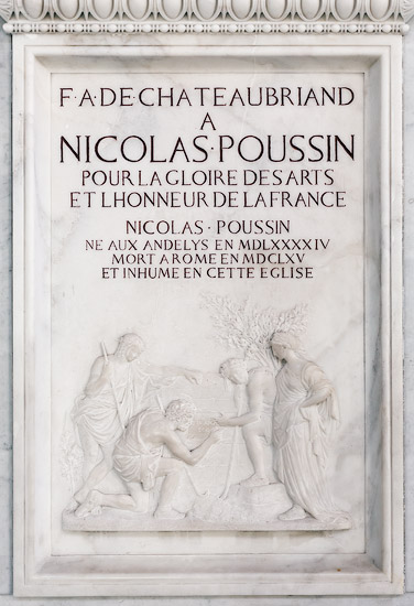 终于,我拐了个弯,来到一个广场,卢奇纳(Lucina)教区的圣洛伦佐教堂(San Lorenzo)就矗立在这里。走进教堂,我看到了尼古拉斯·普桑(Nicolas Poussin)朴素的白色墓室,墓碑上的浮雕画正是他的《阿卡迪亚的牧羊人》,这幅画现在藏于卢浮宫。画中三个牧羊人围着阅读石棺上写的碑文“Et in Arcadia Ego”,意思是“我也在阿卡迪亚”。对这句话就有不同的解读了:“我”是谁,是这个曾经在阿卡迪亚无乐不作,如今化归尘土的死者,还是连最美的地方都无法逃脱的“死亡”本身?不过至少我知道,自己该停下来了。