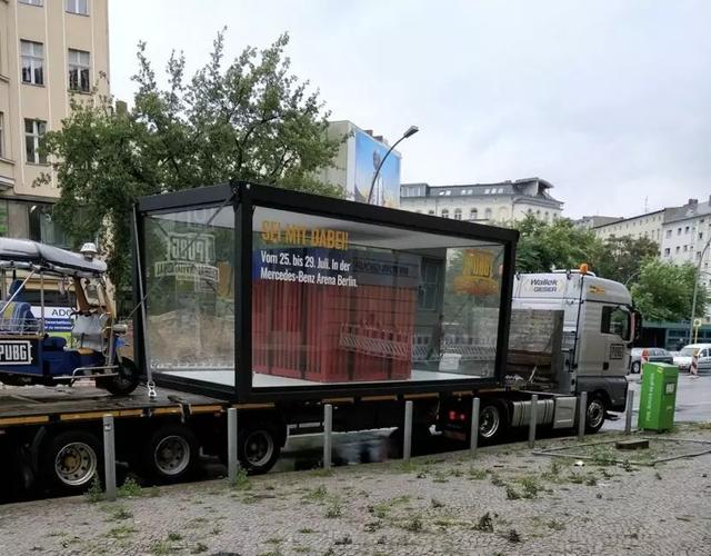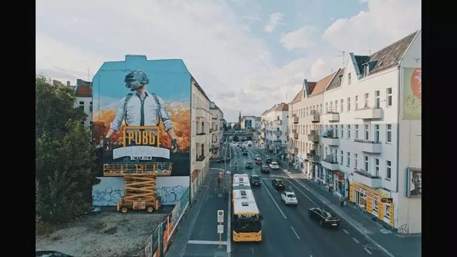 在柏林车水马龙的大街上,厂商蓝洞包下了一栋楼房的外侧面,绘制了一副巨大的涂鸦画,《绝地求生》标志性的三级盔在画上格外显眼;而在另外一条街道旁,放置着一个同样在游戏中具有标志性的空投箱,以及停放着几辆和游戏中一模一样的公交车、皮卡等载具。