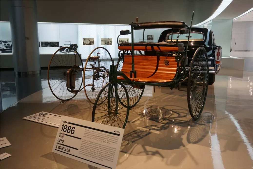 ▲首先自然是人类历史上公认的第一台汽车——诞生于1886的奔驰一号。它的旁边陈列着1882年的美特罗三轮自行车,和奔驰一号一对比,仿佛像是它的鼻祖。