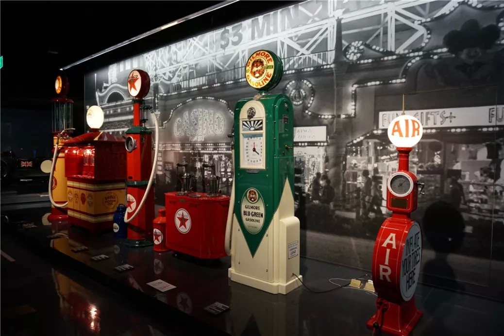 ▲除了汽车本身之外,展馆内还很用心了搜罗了当时的一系列相关配套设施,包括20世纪20-40年代的各式各样的加油机和轮胎充气机。