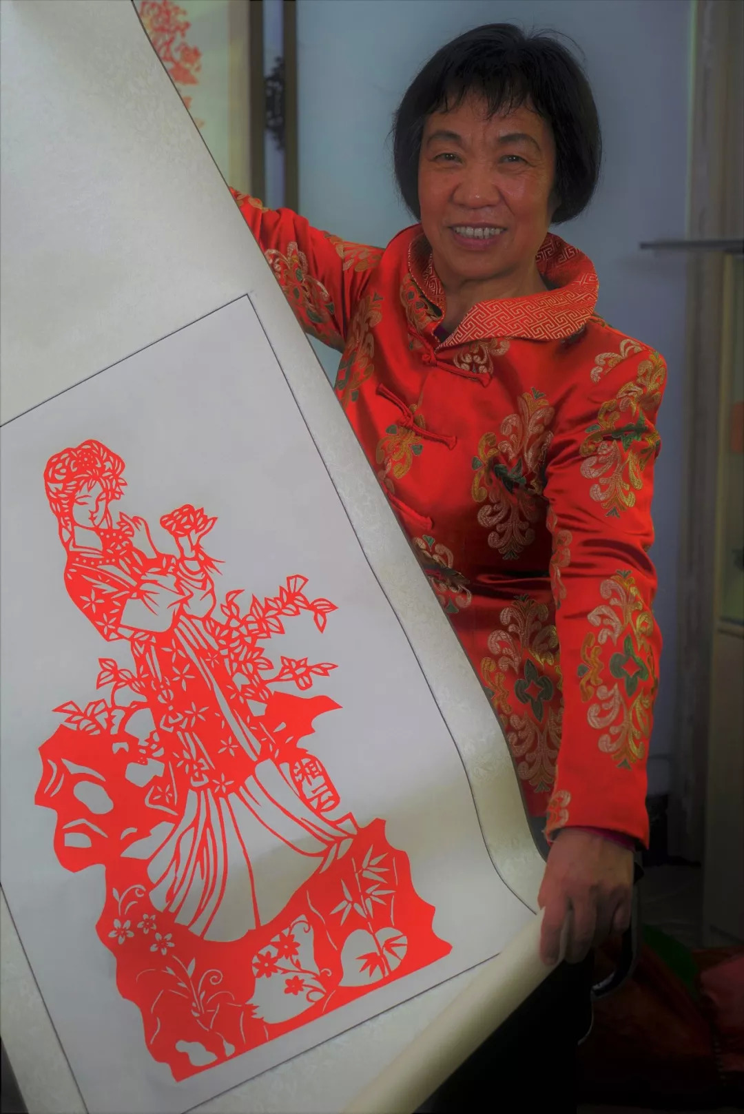 “我从小就很喜欢剪纸,因为我的母亲也会剪纸。小时候家里窗户棱上,有小蚂蚱、小蝙蝠、梅、兰、竹、菊等。但是因为当时上学,没时间学,老人怕我耽误学习,不让学。只能等家人做饭的时候,偷偷去炕上剪上几下。后来被爸爸发现,他很生气,说家里就我一个孩子,必须专心读书,就那以后我就不敢动剪刀了。”