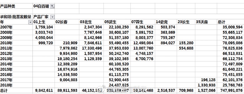 来自中国食品药品检定研究院(中检院)的数据显示,2007年,中国有5家企业供应白百破疫苗;2010年达到顶峰,有7家。然而2015年-2017年,只有武汉生物、长春长生和云南沃森3家供货,其中作为国企的武汉生物是最大的供应商——2017年,沃森只占0.3%,长春长生占14.5%,武汉生物占据85.2%的市场份额。
