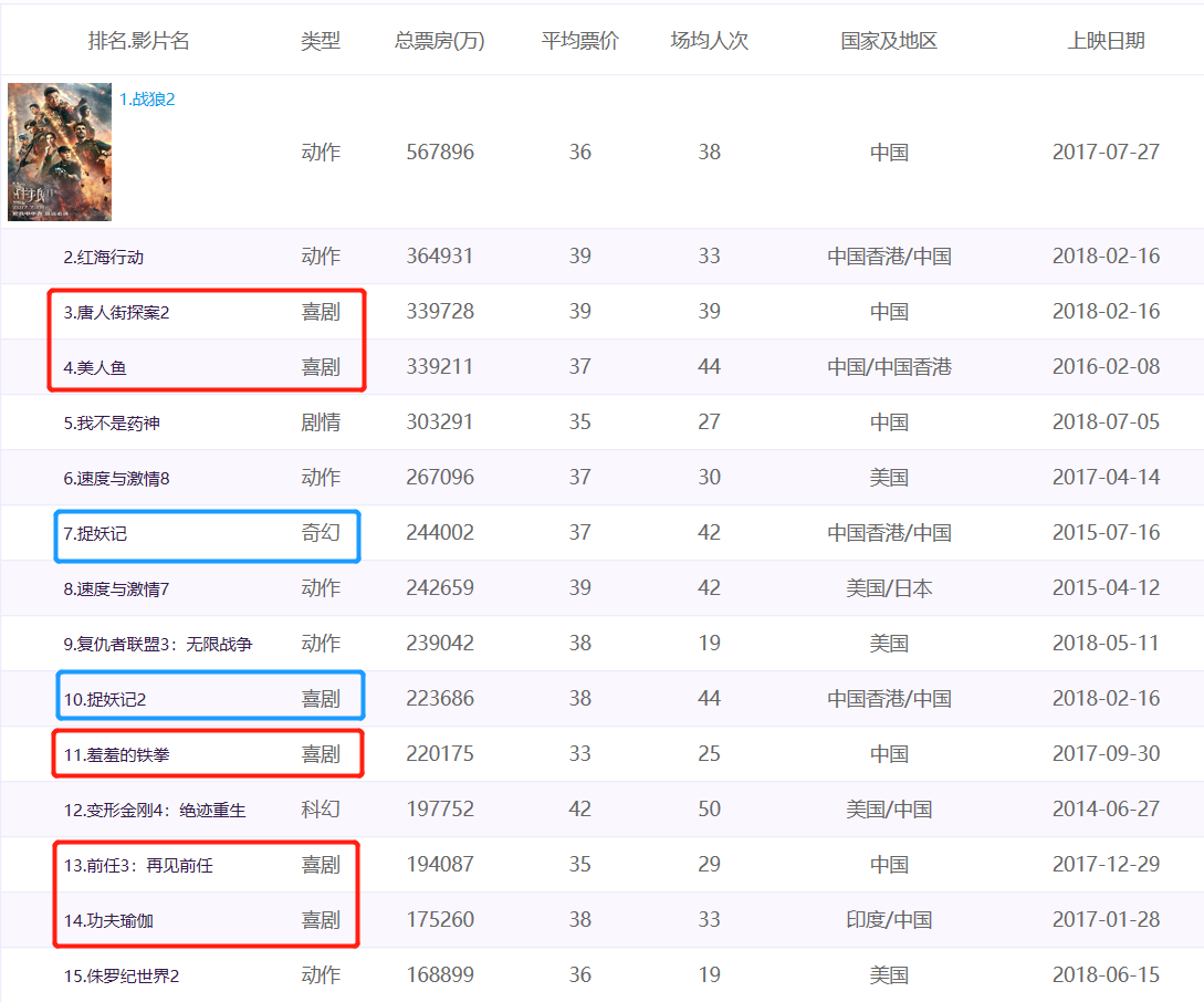纵观一下内地市场总票房前15名(截至2018年7月30日),其中《捉妖记》系列为喜剧+奇幻的搭配,我们纳入喜剧的范畴讨论。从榜单中我们能够直观的看出几乎被喜剧电影和动作电影垄断,喜剧电影为7部,动作电影为6部。我们再仔细看制片国家会发现,动作片中国外制作达4部,而喜剧片则为100%国产,其中《捉妖记》、《美人鱼》等都为当年冠军,更久之前的纪录保持者《泰囧》也能证明如此。