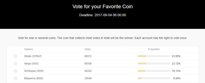 一人只有一次投票权,但是可以投多个项目。在第一期投票中,STRAT 项目获胜,但是为了奖励群众们的热情,STRAT、VERGE、BQX、SNM、SNGLS 这 5 个项目都给了上币资格。