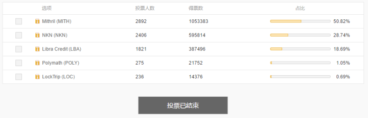为了争夺这一个月才 1 个的免费上币名额,5 个项目方中 Libra Credit、Mthril、NKN 都发动了自己的社群来拉票。NKN 项目在投票之前开启了一场空投活动来吸引用户目光,票数一路飙升,占有了本次投票 50% 以上的票数。