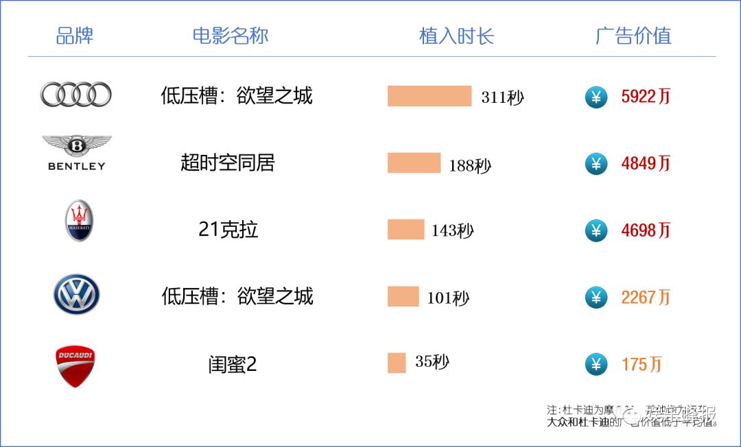 在统计内的19部电影中,此类品牌植入时长仅占总植入时长的20%。官方品牌也仅出现了杜卡迪、玛莎拉蒂、奥迪、宾利、大众五个品牌,其中大众和奥迪还是在同一部电影中出现。