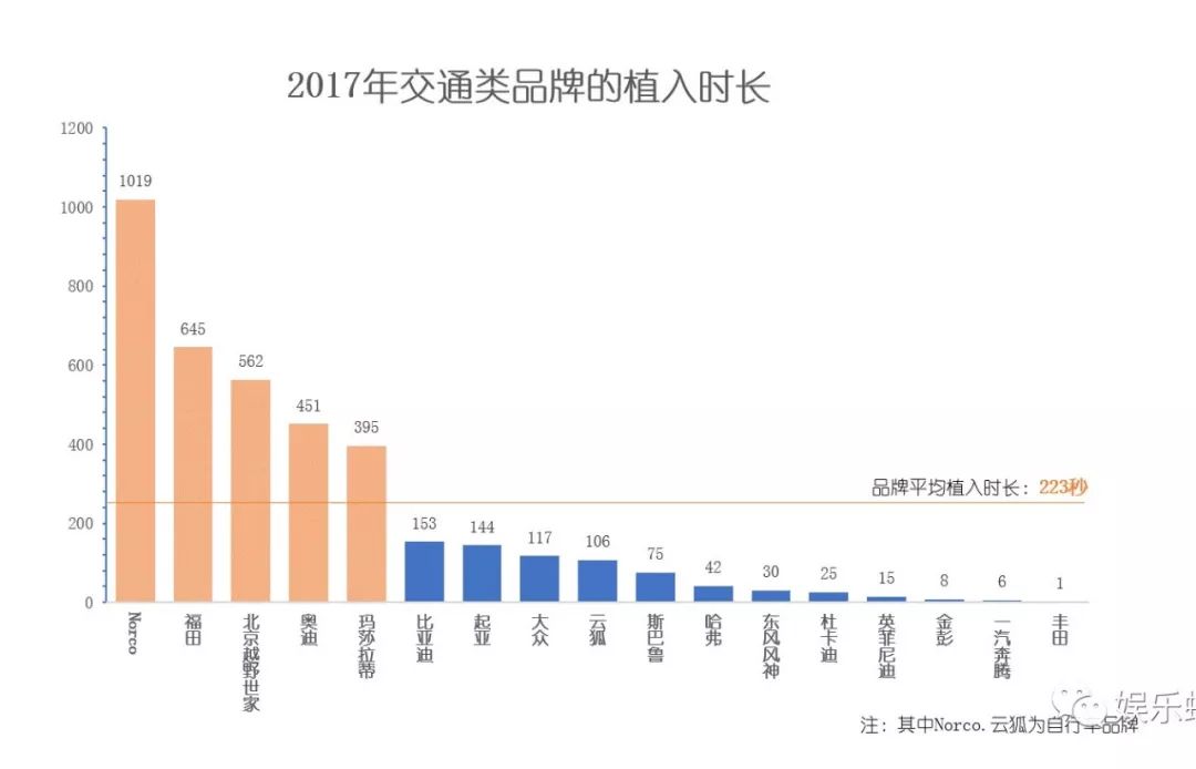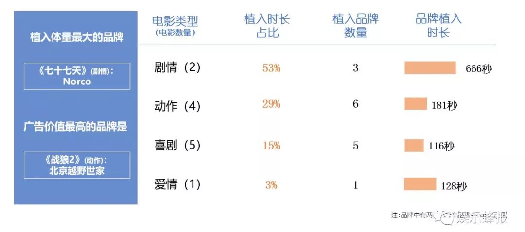 而2017年全年的电影中,出现的汽车品牌数量达到17个,植入时长占比达到33%,品牌的平均植入时长达到223秒(2018上半年的156秒)。