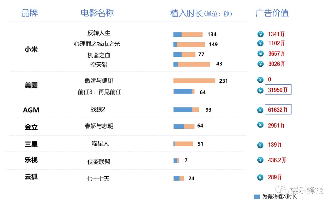 小米、金立、美图等都做过或多或少的植入,品牌的平均植入时长达到134秒,《前任3》美图手机、《战狼2》AGM手机的植入表现突出,拉高了手机品牌的广告价值平均水平。
