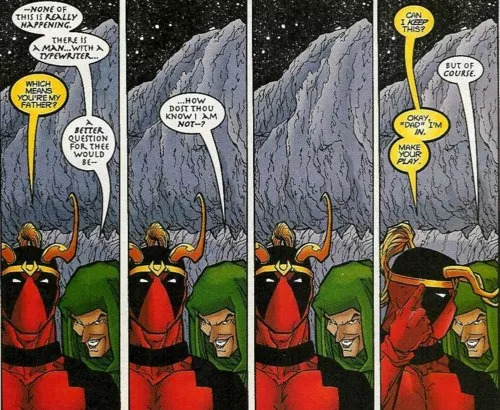 漫画中,死侍的身份就格外不着调。被美国特种部队踢了出去;刚出场时是个反派;有人说他是假的韦德·威尔森,冒认身份好干坏事;还有某金角大王邪神洛基出面,声称“我是你爸爸”。