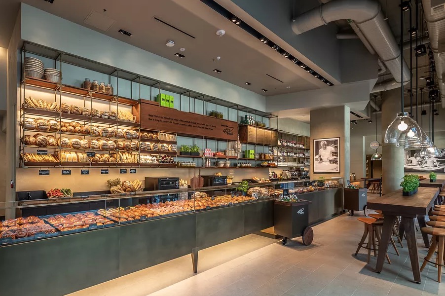店内还设置了面积可观的开放式厨房区域,展示现场烘焙食品的过程,以给予消费者新鲜和开阔感。
