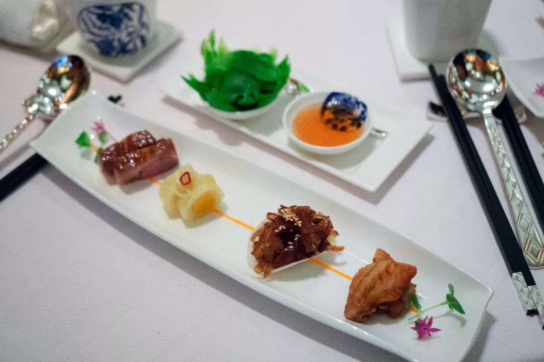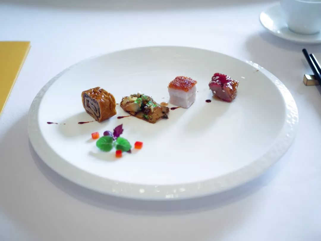 第一道菜是四菜试吃,从左到右依次是“江南菇卷”、“冻鲍鱼”、“澳门脆猪腩”、“西班牙黑毛猪叉烧”。这只冻鲍鱼口感冰凉,算是开胃,而一小方块的麻皮烤猪腩则算是有名的菜品。