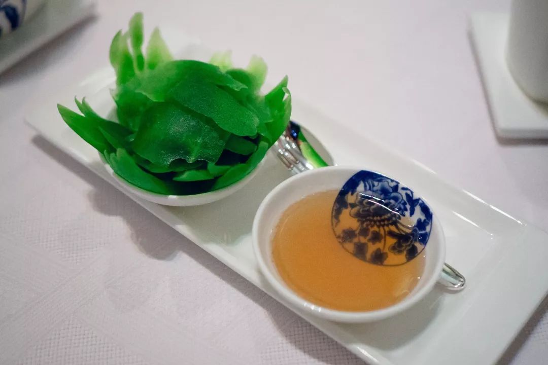 印象最深便是这道“茉莉海蚌清鸡汤”,茶壶里倒出的并非“茉莉茶”,而正是“清鸡汤”。鸡汤清澈如水却并不寡淡,即便不谈味道,仅仅是思考“到底怎么把鸡汤熬到透明”就是一大就餐乐趣。