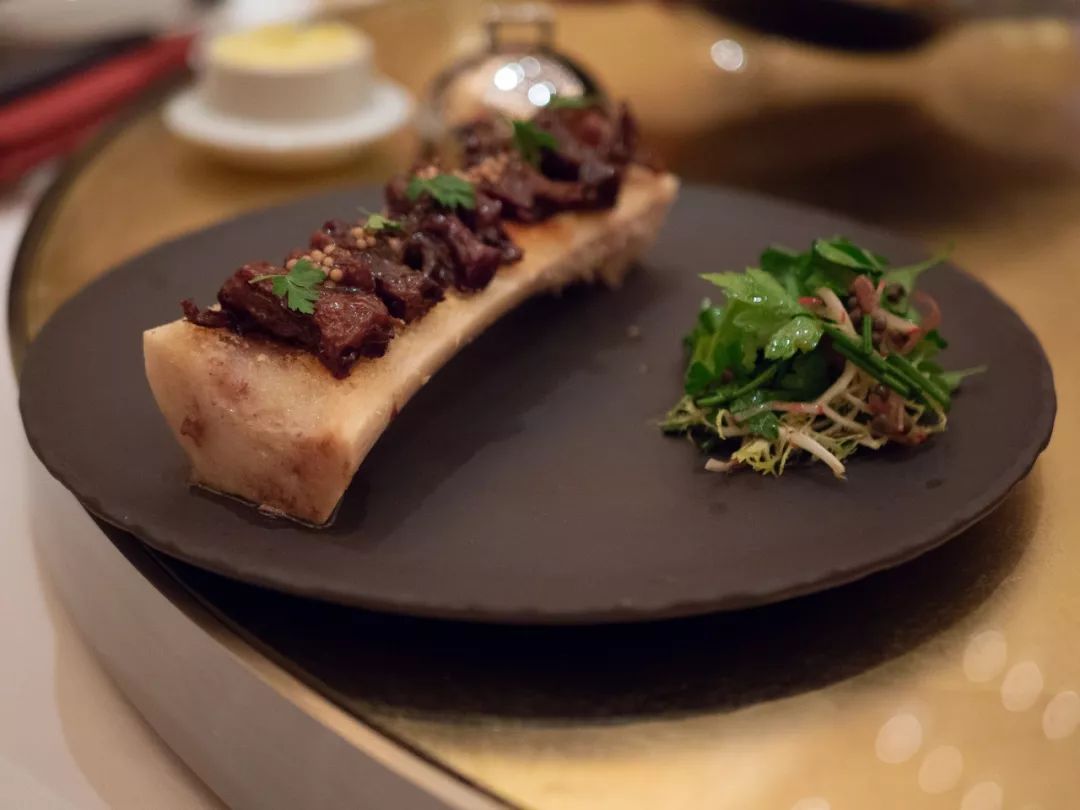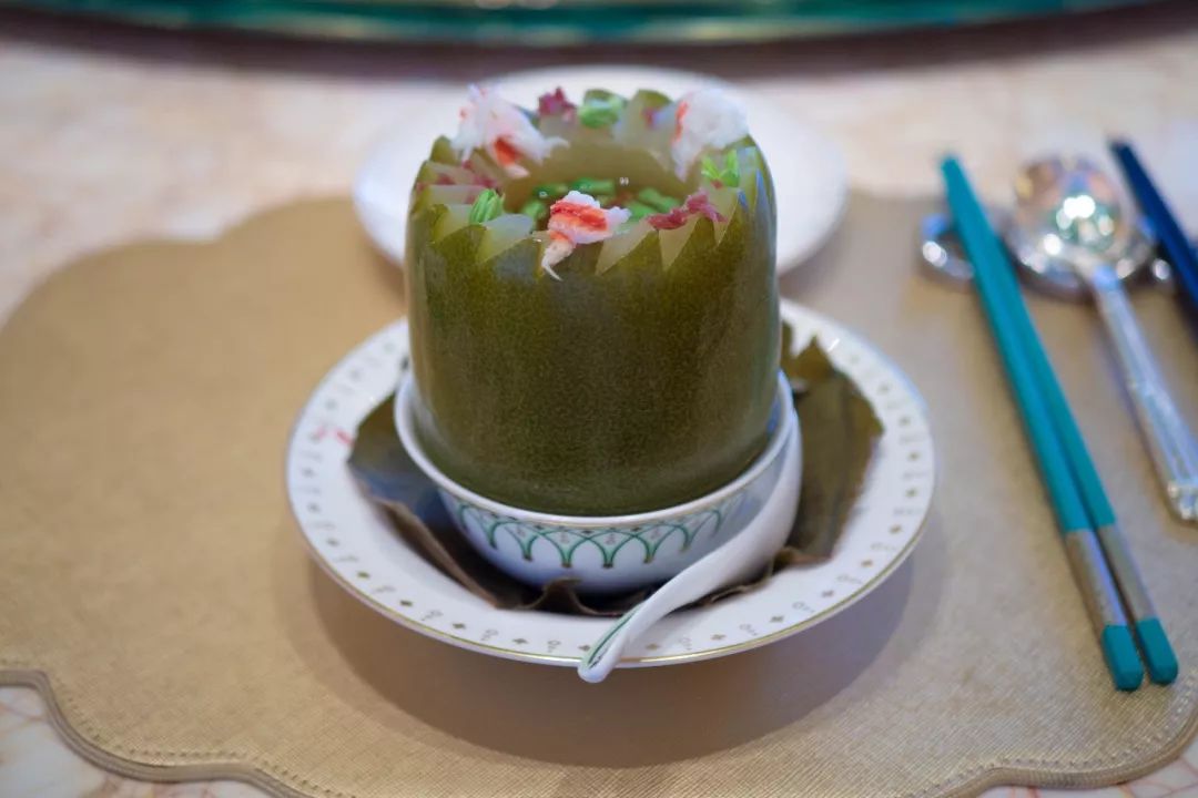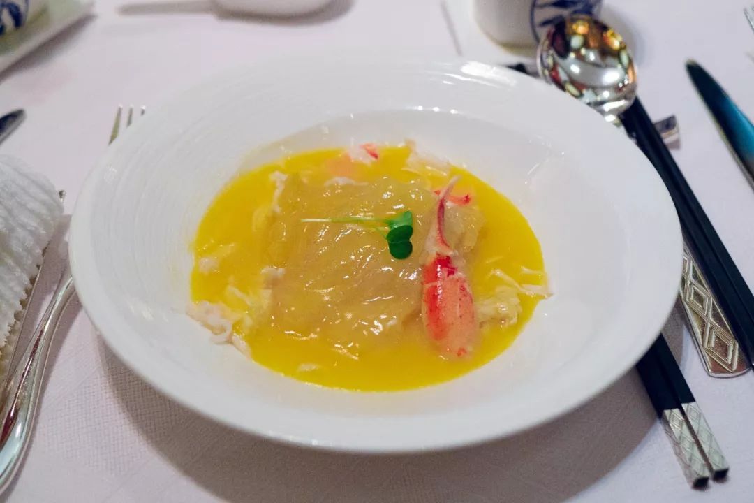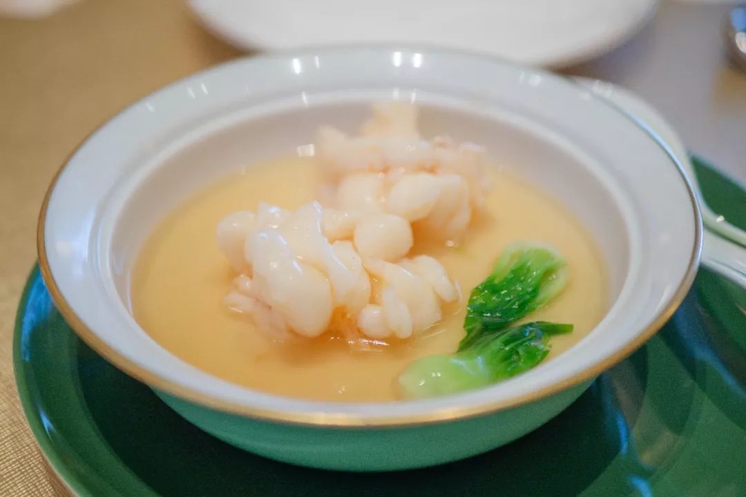 整个行程印象最为深刻的菜当属这道“八宝迷你冬瓜盅”,汤中加入了雪蟹、龙虾粒、火腿和夜香花等数种食材,闷在冬瓜里蒸数小时,一勺一勺喝的过程中不断能舀出新的食材,让我有种在挖宝藏的感觉。冬瓜则同时起到保温作用,喝到最后一口时,汤的温度也没有半点下降。