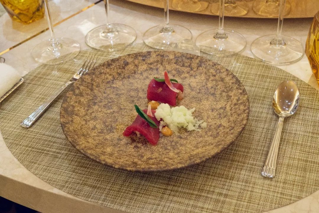 头菜是“香辣蓝鳍金枪鱼生鱼片”,正当我对着两个鱼片不知道该做什么的时候,Thitid 为每个人都盛上了一勺来自泰国的酱料,这种酱口感冰凉刺激,正适合作为生鱼片的佐料。吃完鱼片后看到还剩下一点酱,直接吃掉也非常爽口。