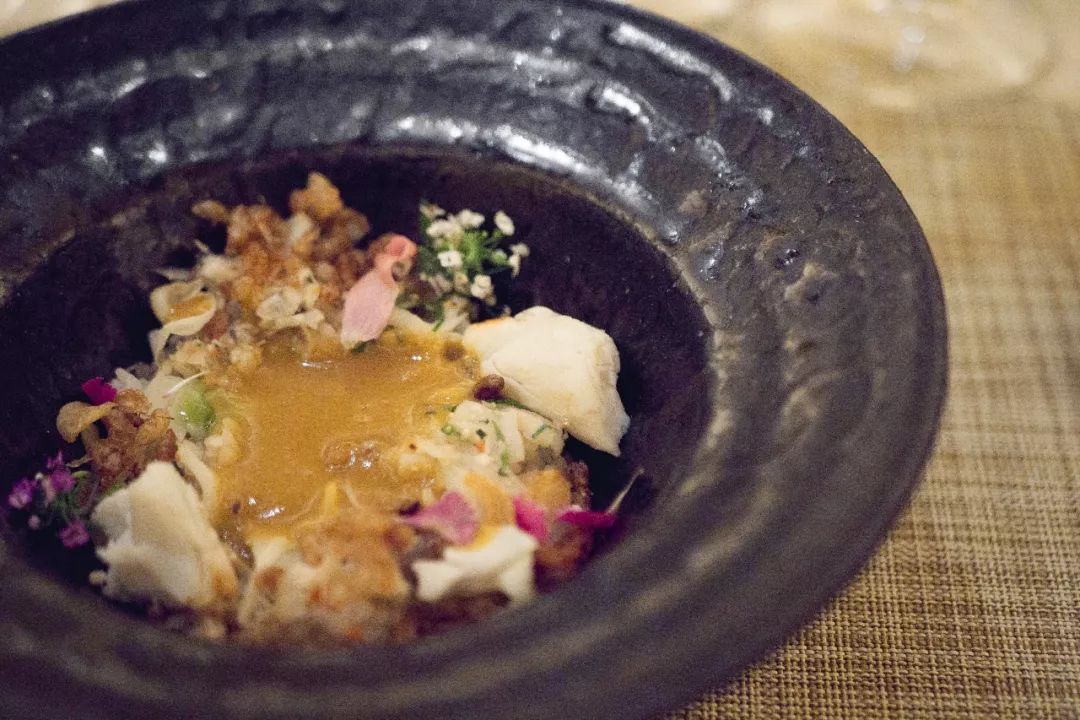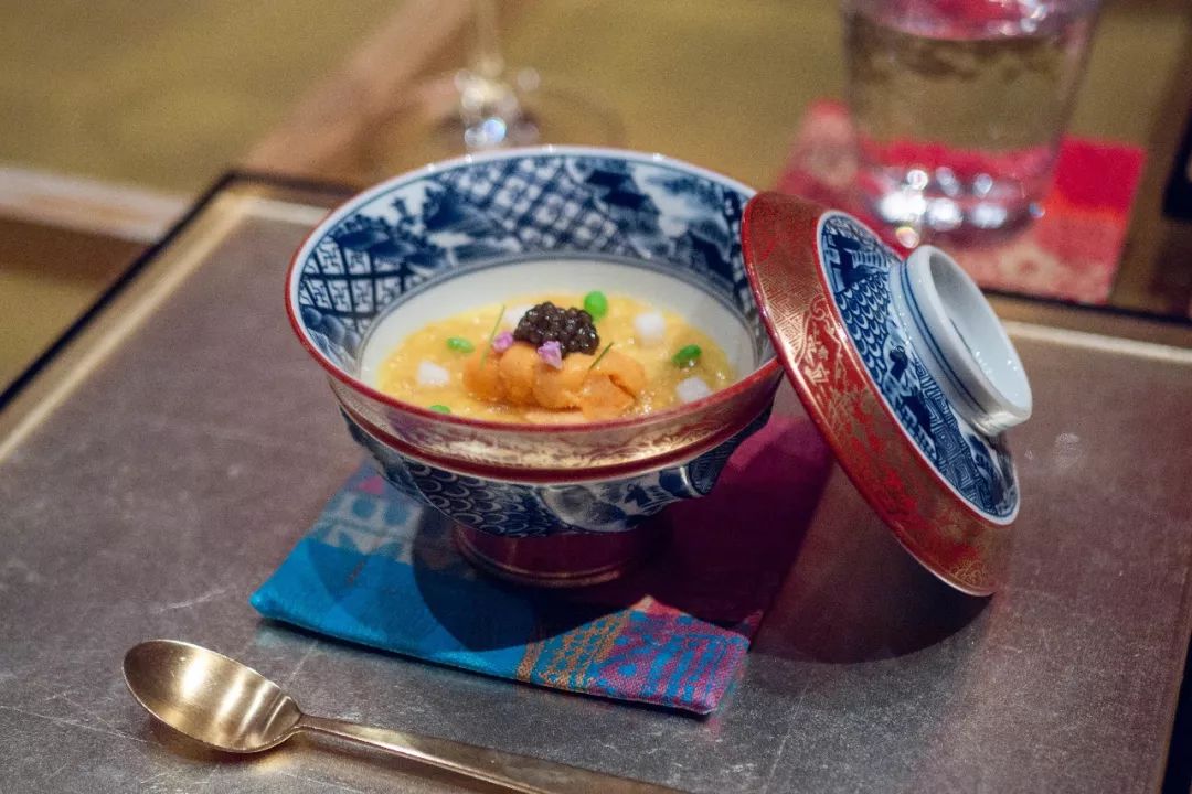前菜是来自北海道的甜玉米与马粪海胆共同调制的“季节之选”,“马粪海胆”与“猫屎咖啡”的起名原理不同,仅仅是因为外形长得像马粪而得名。而北海道的甜玉米则与海胆交融在一起,让这道菜同时拥有海胆的口感和玉米的甜味。
