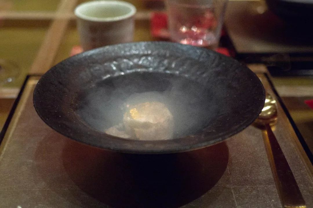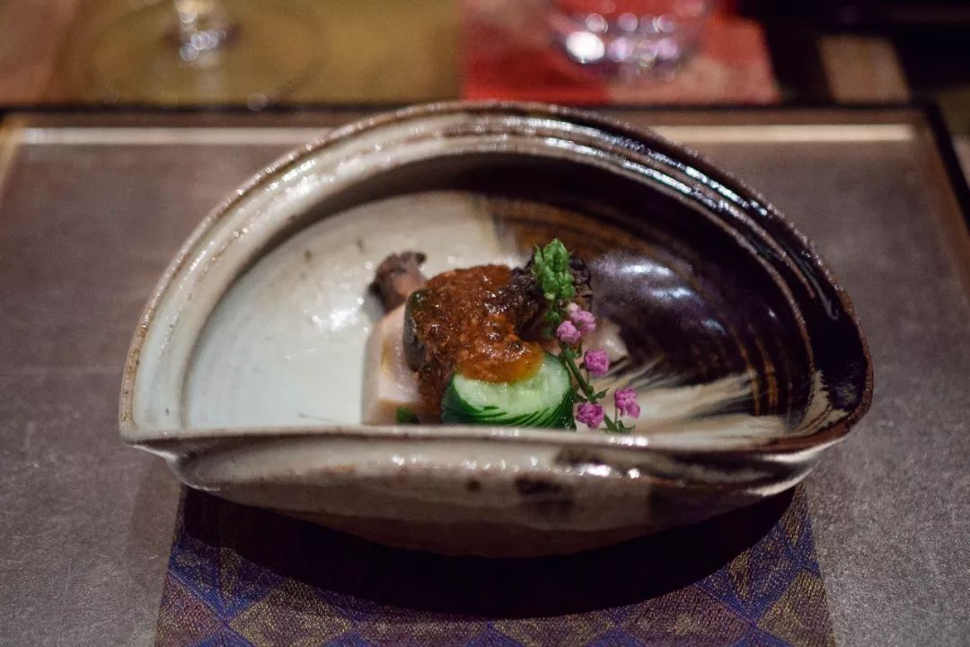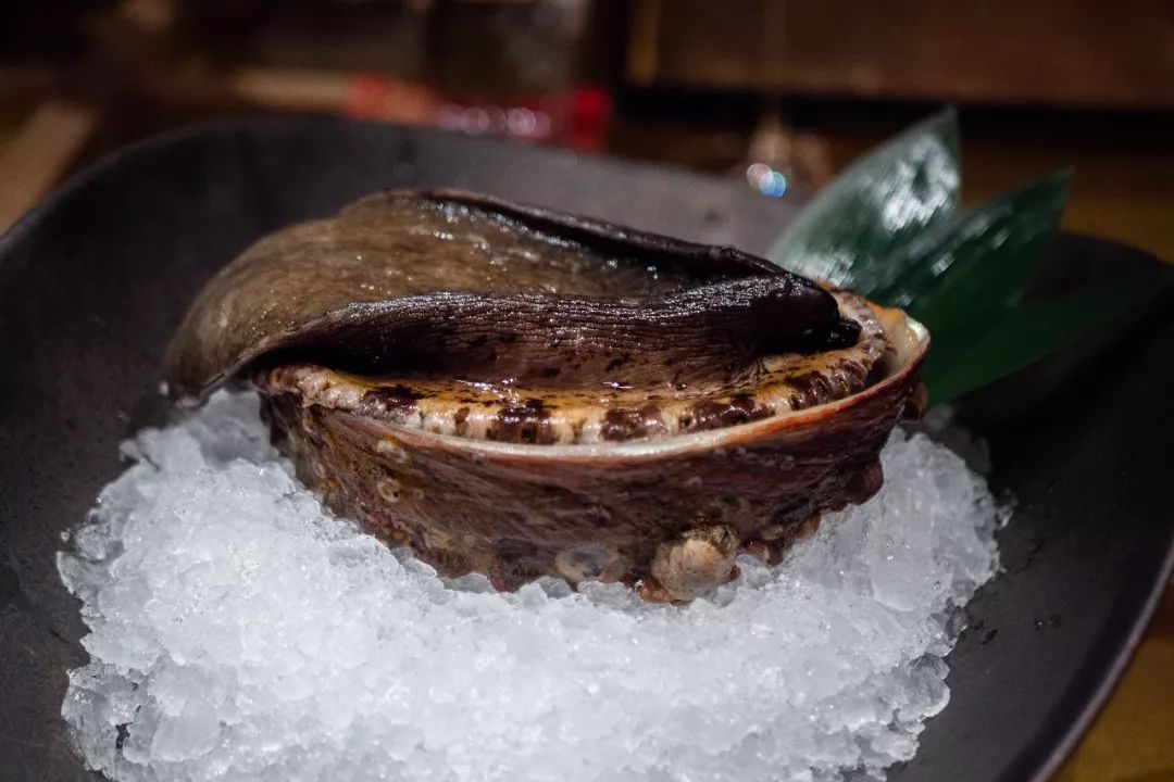 在所有人还未坐定时,一只来自千叶县的黑边活鲍就被端上来供食客观赏,这只鲍鱼有两个手掌大小,据说这么大的鲍鱼在内地根本没有引进,它也再一次印证了怀石料理食材珍稀的特点。