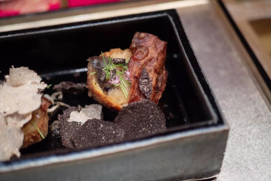 来自法国佩里戈尔的夏季松露与青森县牛蒡、炸土豆共同组成这道炸物:来自大地的礼物。土豆在这之中作为配角非常松软,完美凸显了牛蒡与松露的味道。