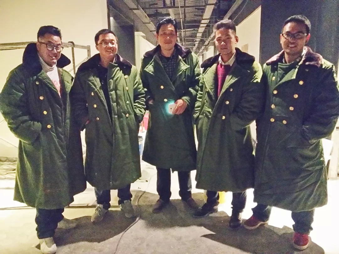 ▲左一丰台吴彦祖,右二大兴彭于晏。冬夜里,有戏电影酒店创始团队在工地上靠军大衣御寒。