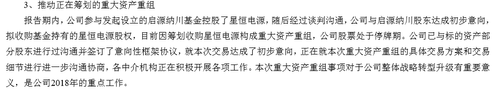 据纳川股份2017年财报显示,星恒电源是国内一线的锂电池制造企业。在新能源汽车领域,星恒电源的超级锰酸锂产品使其快速成为国内众多新能源物流车制造商的第一供应商;在轻型电动车领域,星恒电源稳居国内电动两轮车市场占有率第一,同时在欧洲电动两轮车市场占有率第二。纳川股份认为,“收购完成之后,星恒电源将会成为公司新能源汽车板块新的生力军。”而收购星恒电源的重大资产重组事项被当作纳川股份2018年的重点工作。