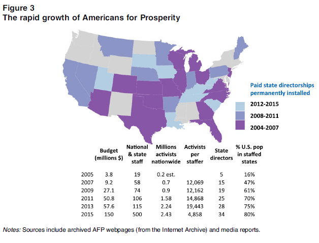 从覆盖人口比例来说,科赫兄弟于2004年成立的政治组织“美国繁荣”(Americans for Prosperity,简称AFP) 在2015年的预算达到1.5亿美元,遍及35个州,可覆盖全美80%的人口。AFP三分之二的管理人员曾经在共和党内就职,三分之一在离开AFP以后会参与到共和党竞选活动中。对于这个既有企业性质又有联合会特点的另类机构,哈佛大学教授斯考切波和费尔南德兹将之描述为,在各个层面和共和党平行甚至是互相补充的庞大政治组织。