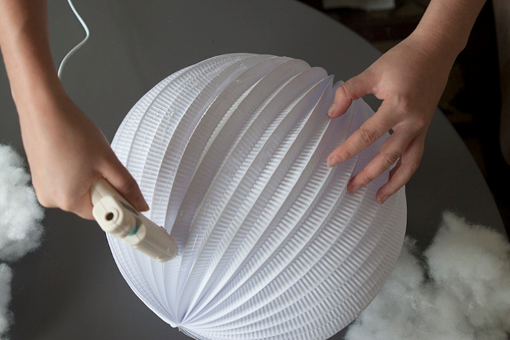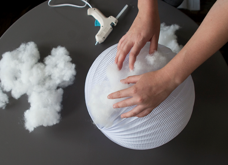 用钓鱼线将灯悬挂起来,可以将棉絮稍稍拉扯,塑造云朵造型。