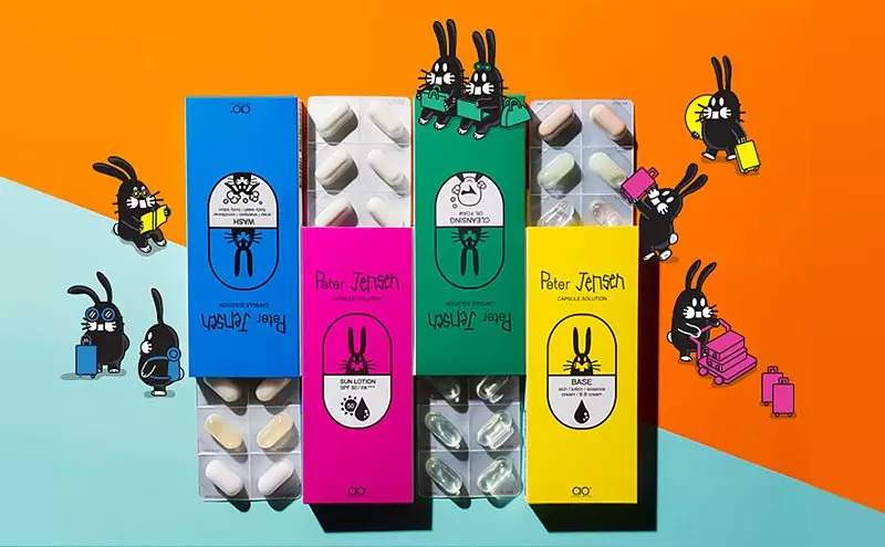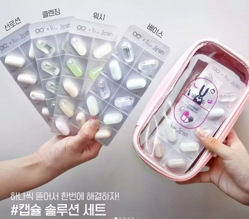 韩国护肤品牌ao+和设计师品牌Peter Jensen推出旅行装胶囊外形的化妆品,就像胶囊药丸一样,一版有10粒,目前有4个版本,一为基础护肤胶囊,一片上有爽肤水、乳液、面霜、精华和BB霜各2粒;二为卸妆胶囊,卸妆产品10粒;三为洗护胶囊,有皂液、沐浴露、洗发水、护发素和身体乳各2粒;四为防晒乳液10粒,防晒值为SPF50 /PA+++。单款售价为15000韩元(RMB95),4款胶囊加一个化妆包的套装售价为65000韩元(RMB411)。包装上有Peter Jensen的兔子logo。