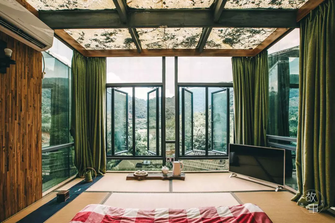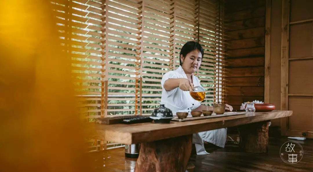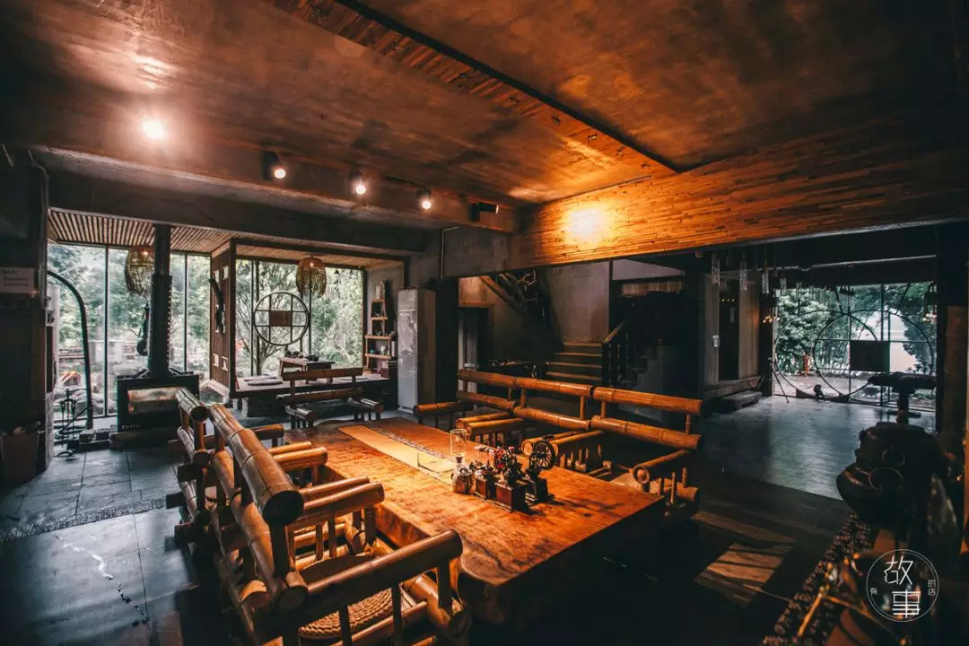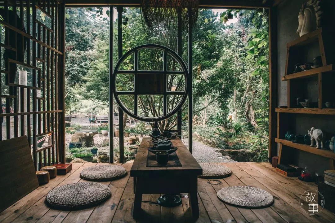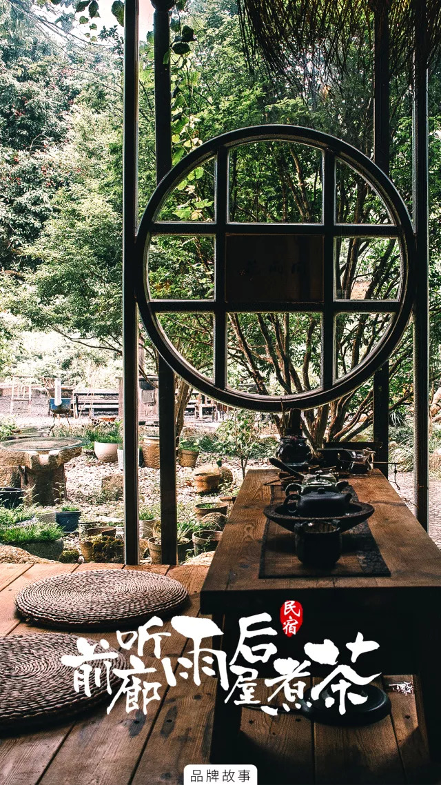 一条约40厘米长的水沟围绕在客栈周围,踏过水沟上的青石板,推开圆形的门,则进到了室内。三面巨大的落地窗内,大厅被分成了四个大大小小的茶室,每一个茶室独立却不封闭,临窗听雨,煮一壶热茶,人生何不快哉。